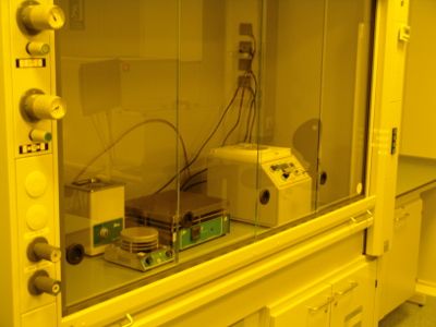 The photolithography hood has the same applications as a normal fume hood and is equipped with a Spinner AC 6000, a precision hotplate, a hot/stirring plate and an ultrasonic bath for working with photoresists. The hood works with yellow light, however the laboratory can work either with yellow or red light.
